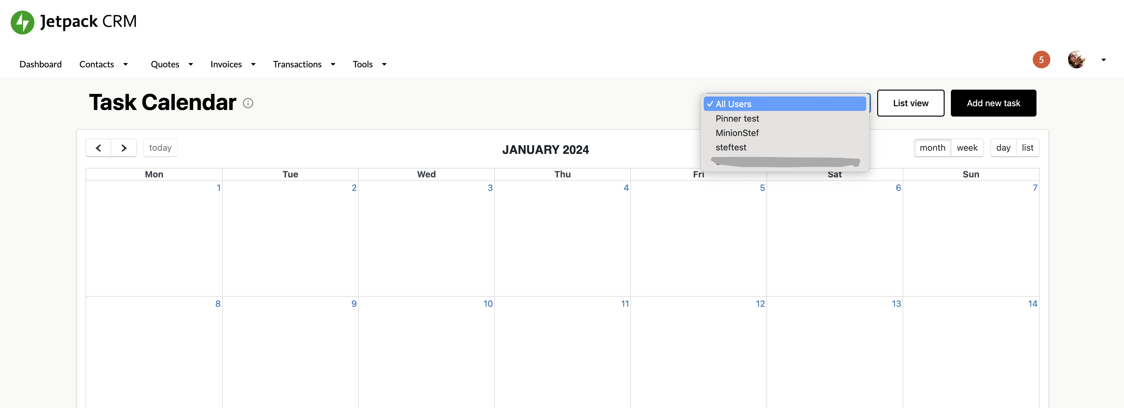 If you then want to filter your CRM task calendar by a specific member, you can do that via the All Users dropdown menu, and select the member whose tasks you want to view.