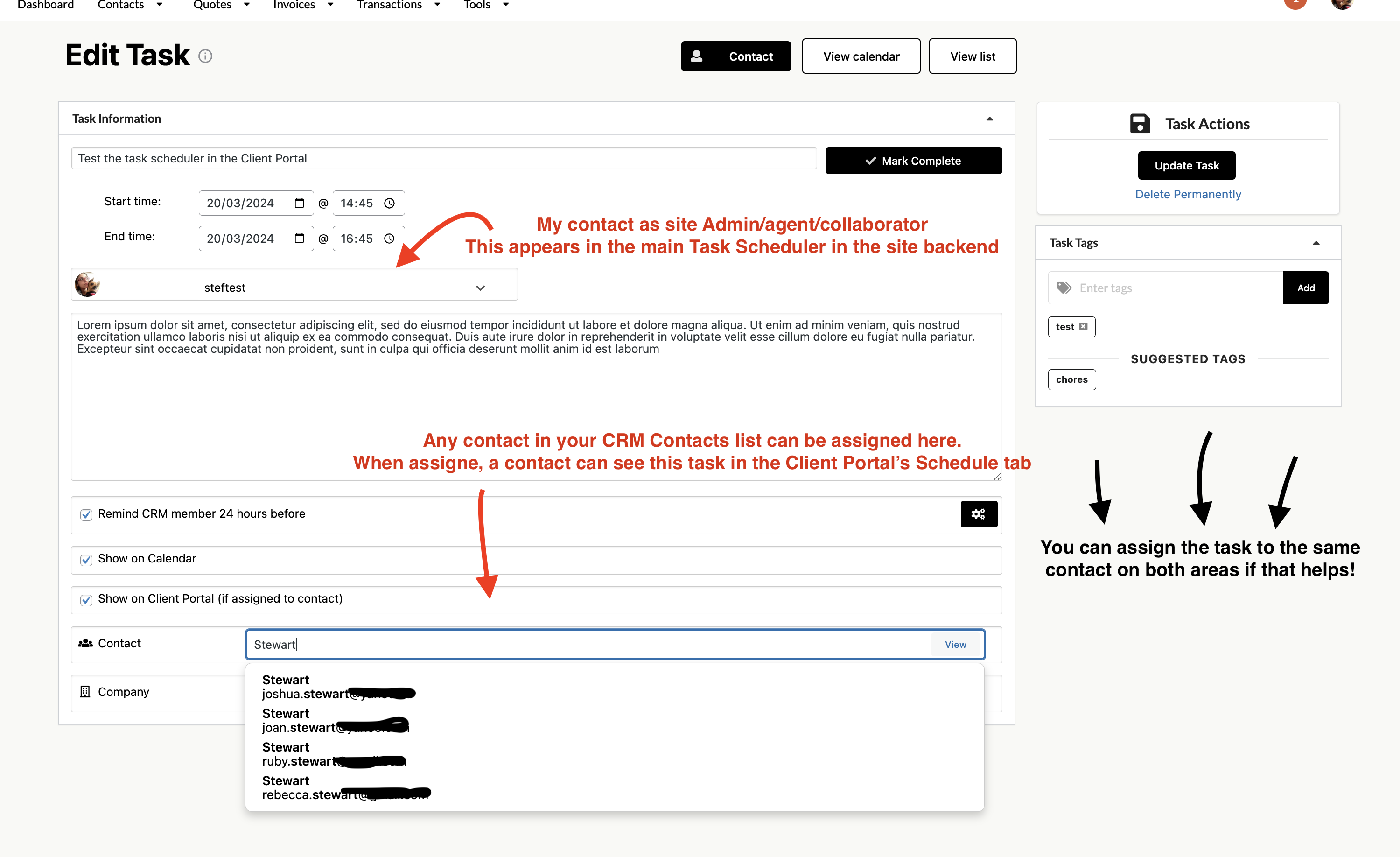 In order to see the tasks in the Client Portal, they need to be assigned to the task also as a contact, as per the instructions above.